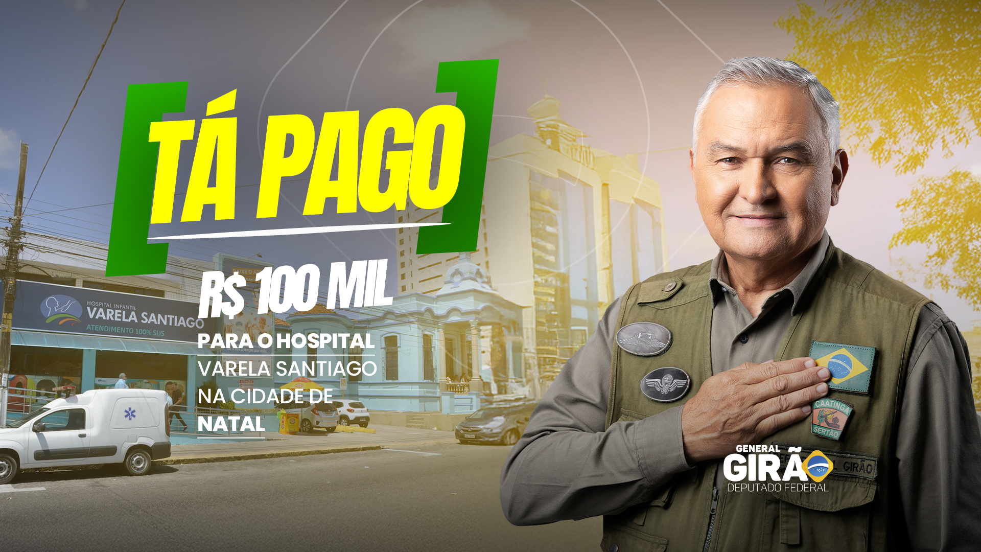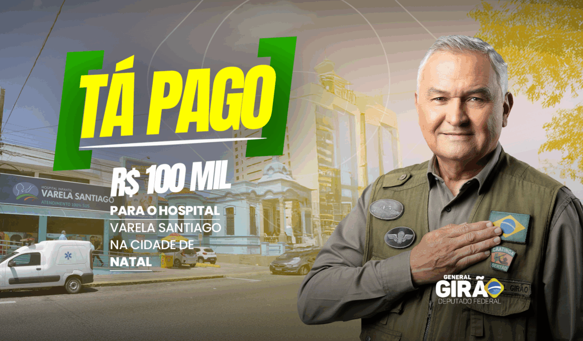 O deputado federal General Girão (PL-RN) destinou R$ 100 mil ao Hospital Infantil Varela Santiago, em Natal, reforçando o compromisso do mandato com a saúde pública e, especialmente, com a proteção e o cuidado das crianças potiguares. O investimento atende a uma solicitação do diretor da unidade, Dr. Paulo Xavier.
